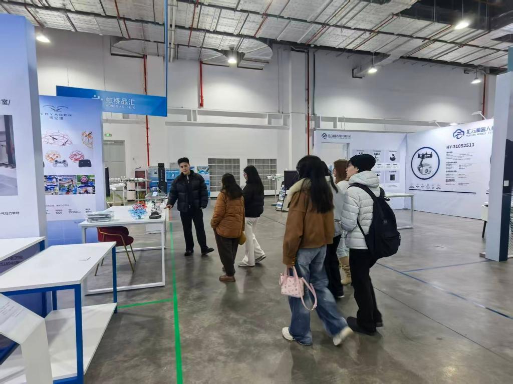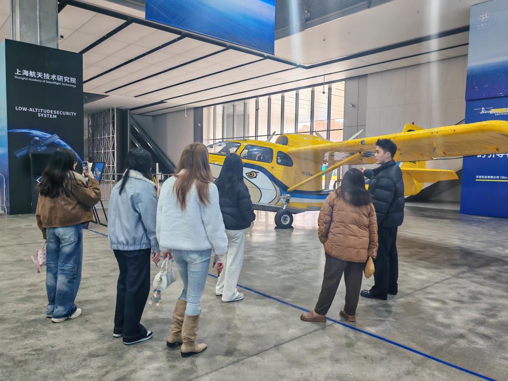 虹桥长三角低空经济展贸中心是聚焦低空经济、无人机等新兴领域的产学研基地。在工作人员的引导下,师生们先后参观了eVTOL、无人机整机展示区及低空安防、氢能航空、通讯导航等上下游产业展区,全面了解了低空经济全产业链的发展现状与未来趋势。